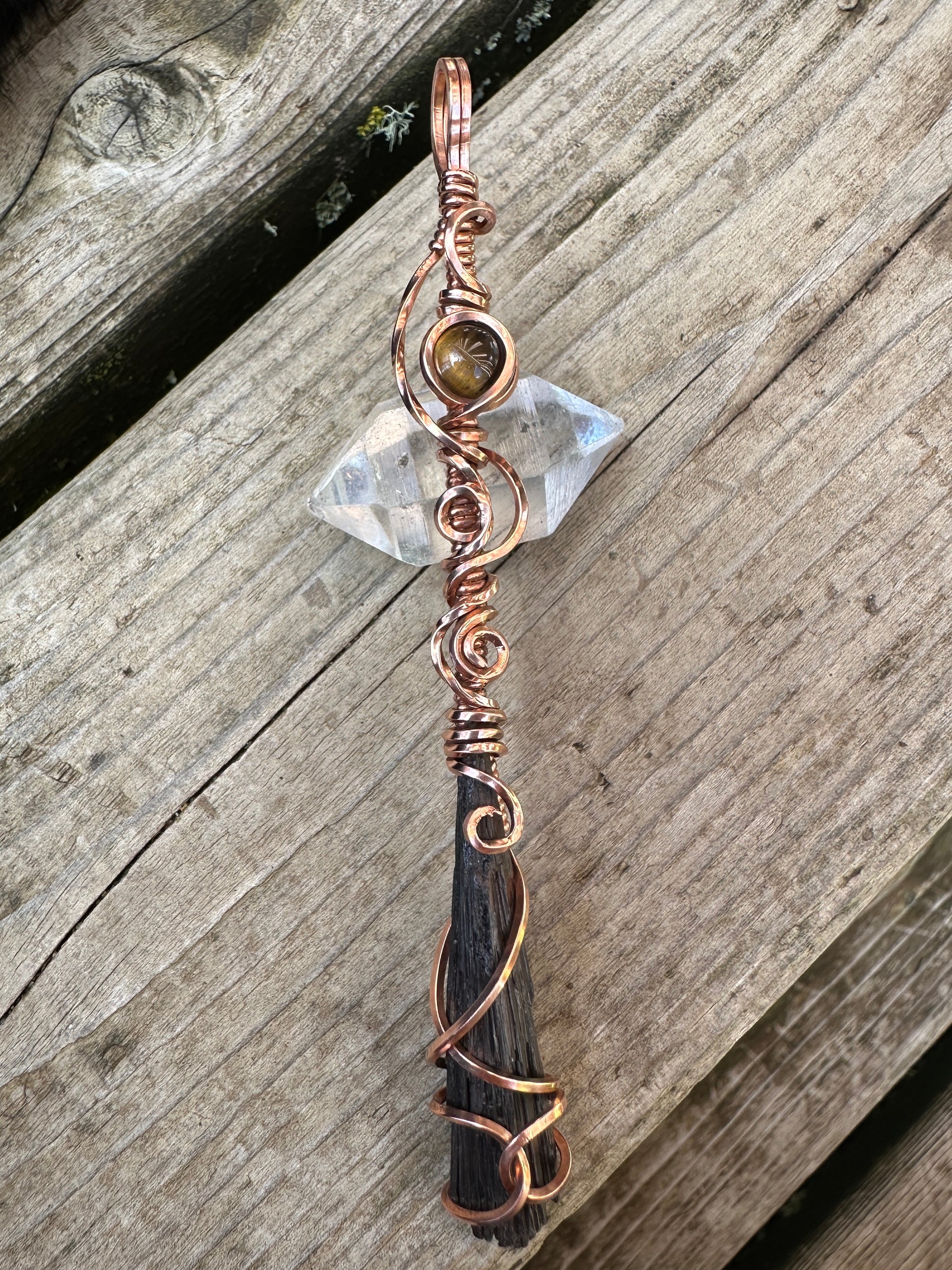 Black Kyanite x Tiger’s Eye Broom Copper Wire Wrap Pendant